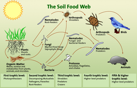 As plants take energy from the sun and water via their roots and leaves, they photosynthesize to produce oxygen which we breathe and carbohydrates (sugars) which they use to grow. Upto 60% of these carbohydrates can be released into the soil through the roots to feed the bacteria and fungi. In return the bacteria and fungi mine the soil for the nutrients plants need. As their predators (Protozoa, Nematodes and Arthripods) feed on the bacteria and fungi, their excreted waste is high in nitrogen and other nutrients which is released in plant available form, in the plants root zone, leading to a balanced and healthy ecosystem.